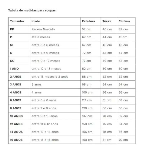 Para te ajudar a escolher o tamanho ideal, confira nossa tabela de medidas.