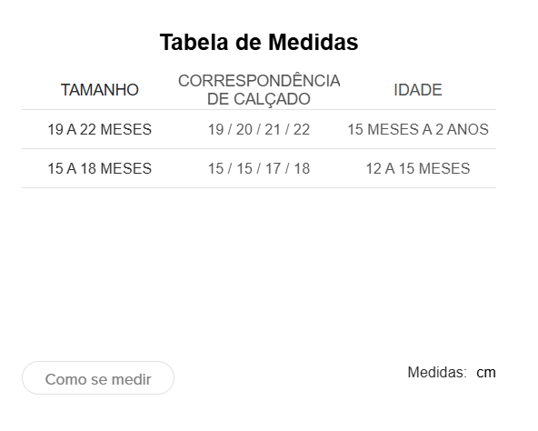 Para te ajudar a escolher o tamanho ideal, confira nossa tabela de medidas.